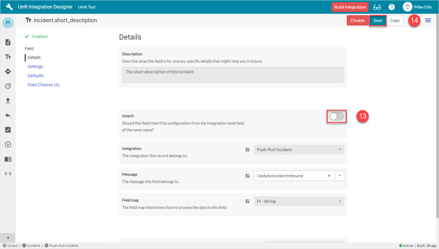 You can either uncheck the Inherit field to configure locally, or edit the integration-level Field record. We will choose to uncheck the Inherit field and configure locally, because we want this inbound Field to be different to the outbound one (and the integration-level Field which was automatically created at that time).