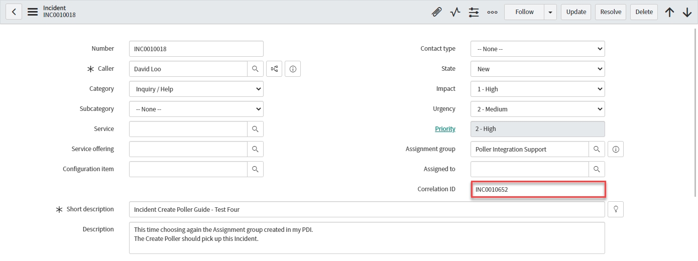 In native ServiceNow, navigate to Unifi > Polling > Poll Requests. Click to Open & view the generated Poll Request. Confirm that only the two Incidents were found (this is exactly as we expect because we are only polling for Incidents assigned to a specific Assignment group):