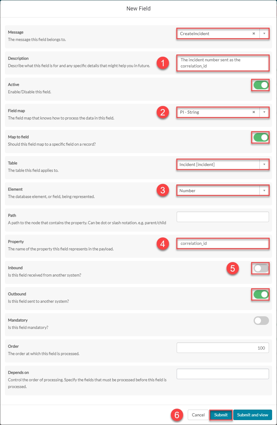 To ensure that our CreateIncident Message is sending the relevant data we need to configure a new Field record that will send the Incident number as the correlation id. We will make use of the previously copied String Field Map record.