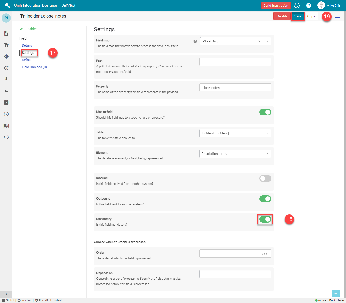 You can either uncheck the Inherit field to configure locally, or edit the integration-level Field record. We will choose to edit the integration-level because it makes more sense to have the same settings for each message-level incident.close_notes Field (i.e. each will be mandatory).
