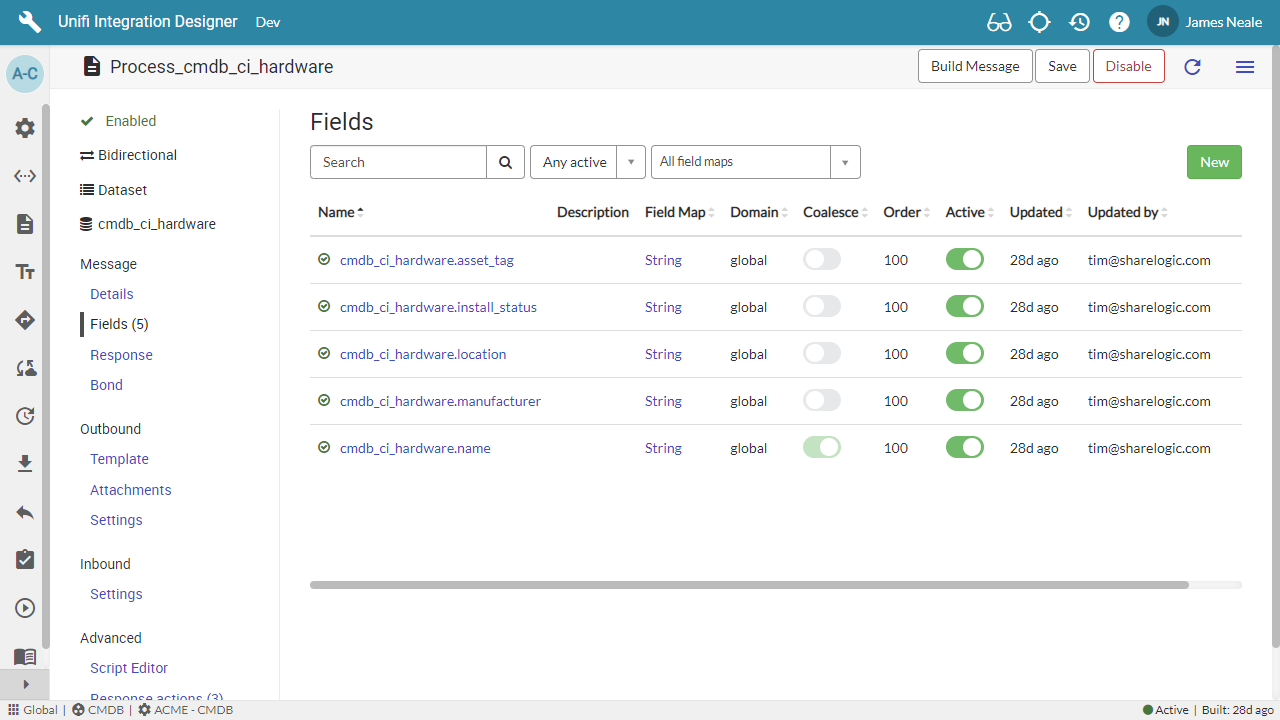 Unifi uses ServiceNow Import Sets since they offer a well understood mechanism for importing data with performance benefits. The mapping is automatically managed by Unifi and handled through a transform script which uses inbound Fields and Field maps (via the Stage to Target Message Script) to transform the data and write it to the target records.