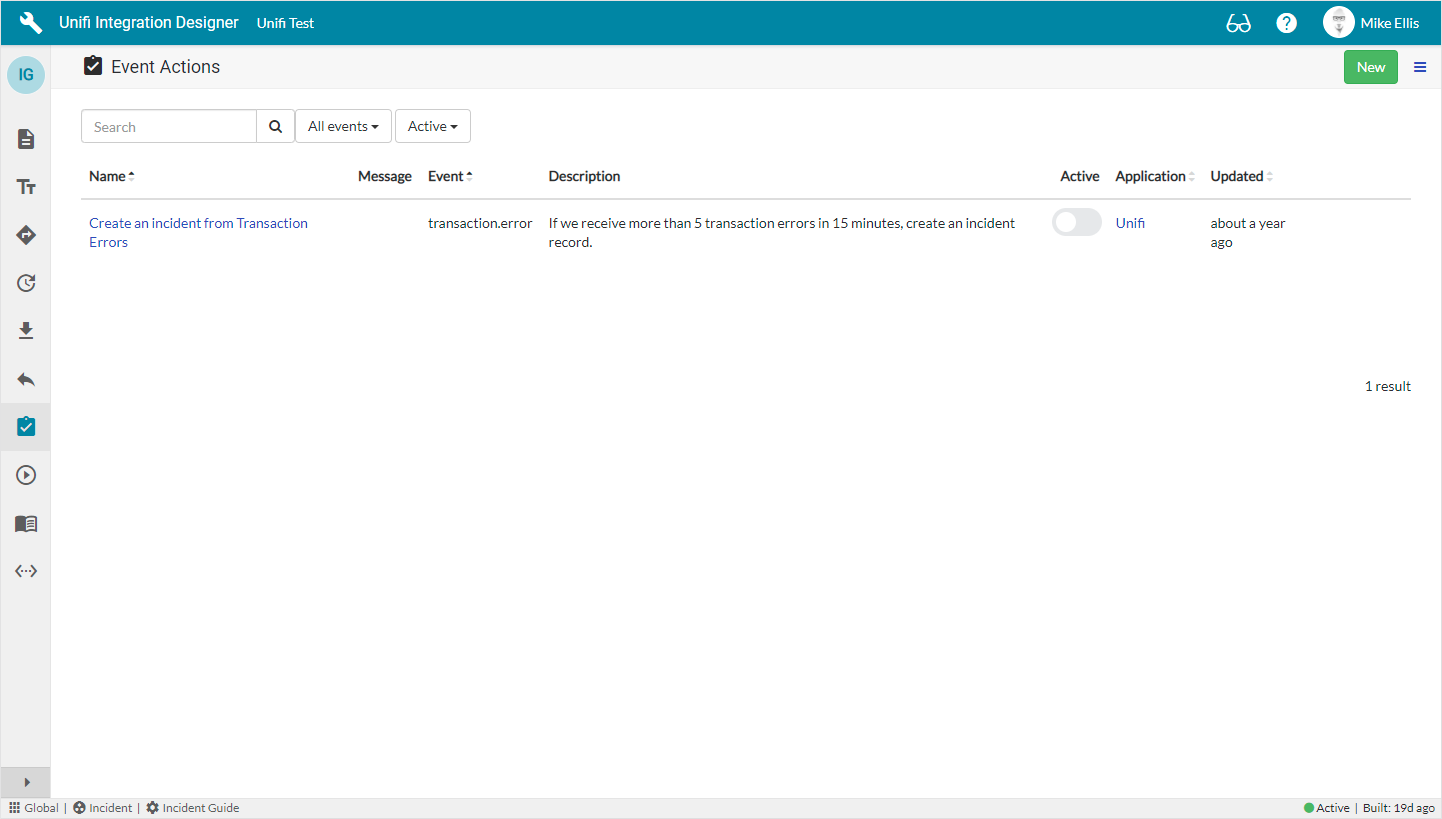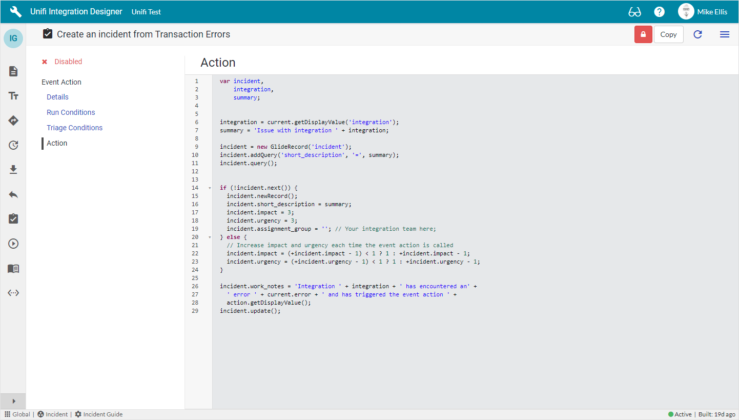 For example, set the Integration status to ‘Up’ to trigger the Event Action only when the the Integration is Up and use the code in the Script action to set the Integration to ‘Down’. Subsequent Transaction events (triggered whilst the Integration is ‘Down’) would then not cause the Event Action to run, because the run condition would not match.