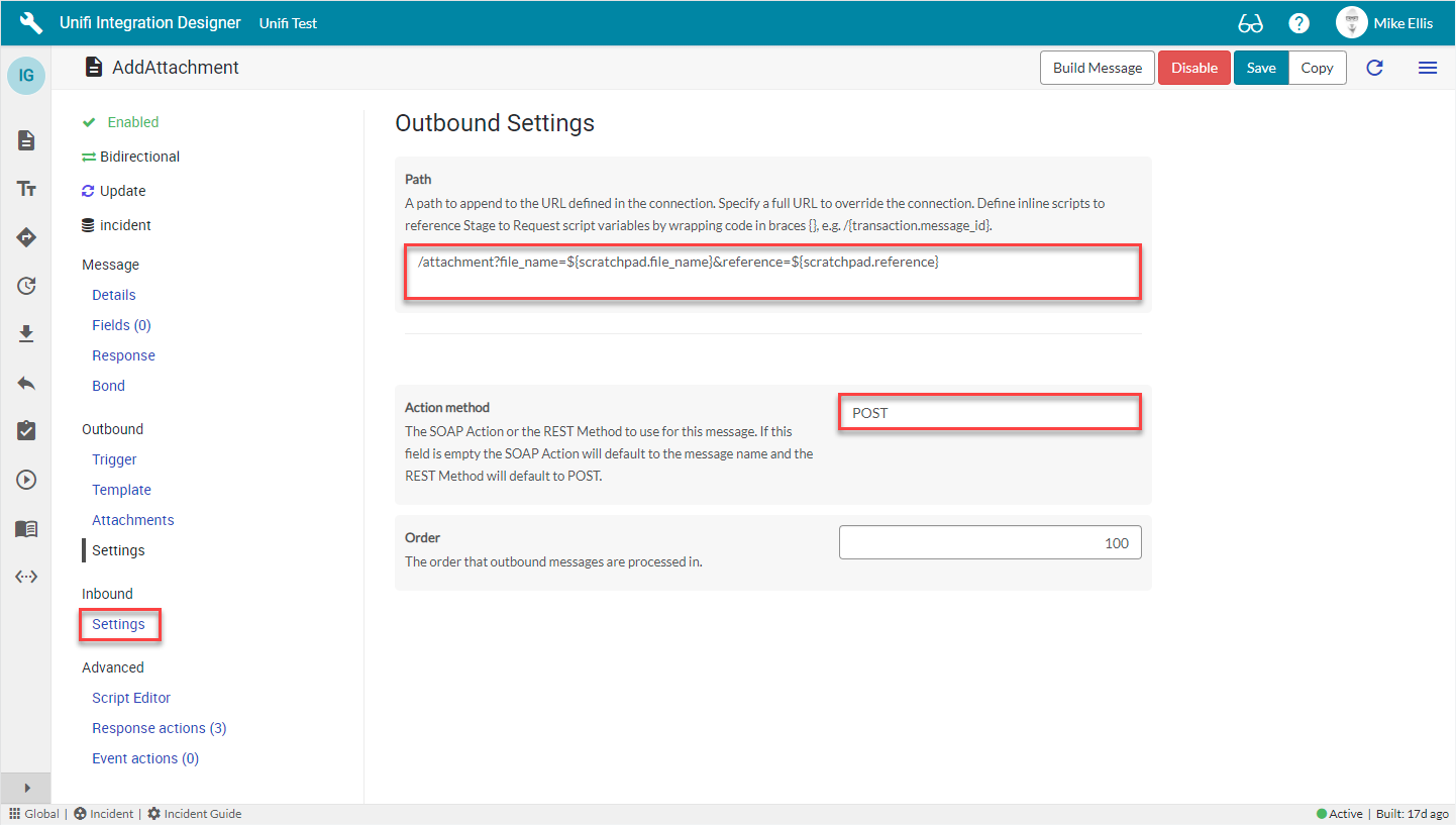 payload: To stream outbound, you will need to set the payload to be "sys_attachment:<sysid>". Unifi will recognise this and automatically stream the attachment out.