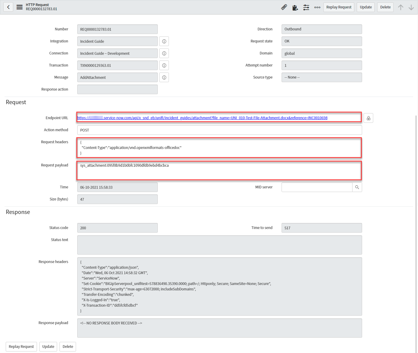 Request payload*: The payload contains the "sys_attachment:<sysid>" (the format which Unifi expects & automatically triggers outbound streaming).