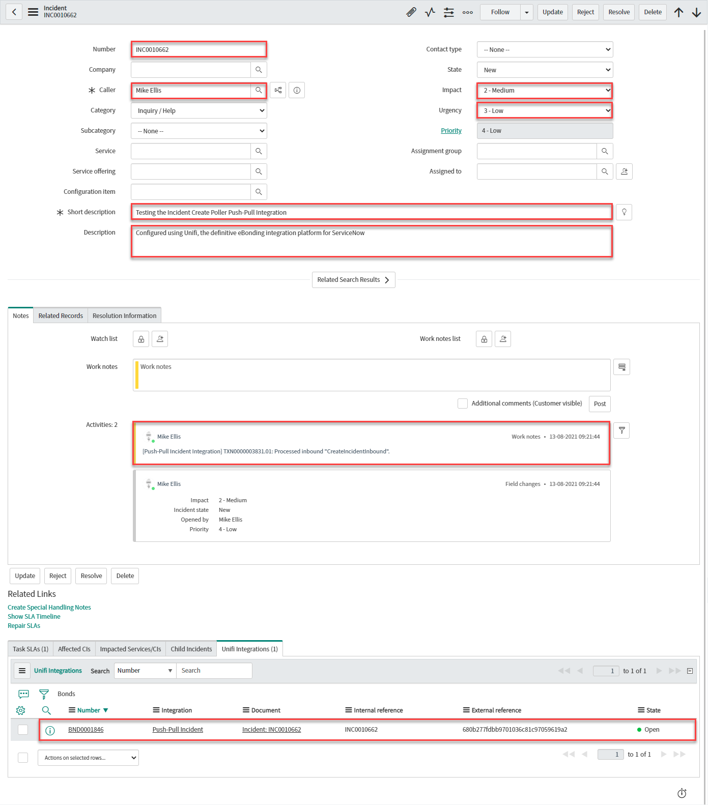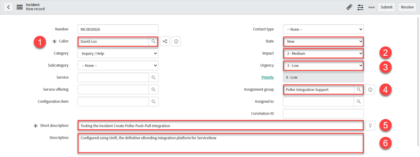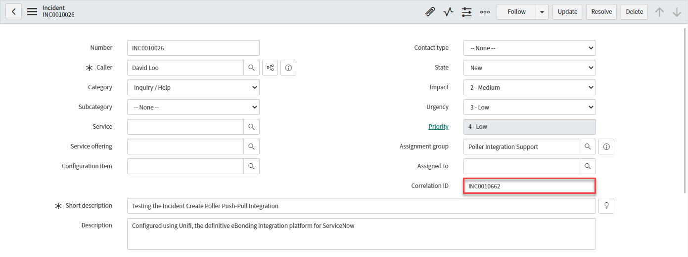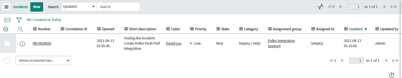In native ServiceNow, navigate to Unifi > Polling > Poll Requests. Click to Open & view the generated Poll Request. Confirm that only the one Incident was found (this is exactly as we expect because we are only polling for Incidents assigned to a specific Assignment group):