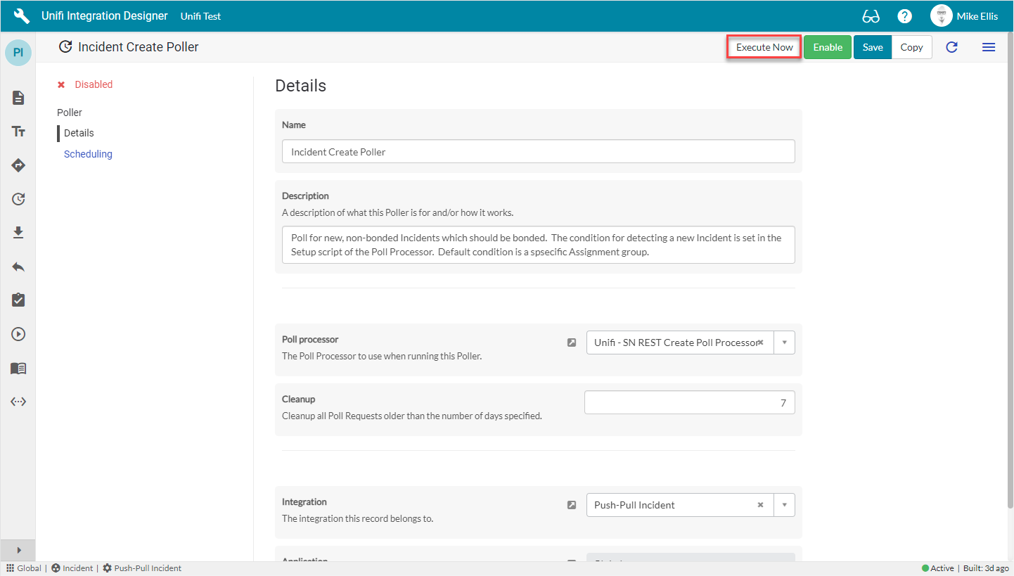 In Unifi Integration Designer, click on the 'Pollers' icon. Navigate to & open < Your Create Poller > (created on the 'Poller' page of the Incident Create Poller Guide). & click Execute Now: