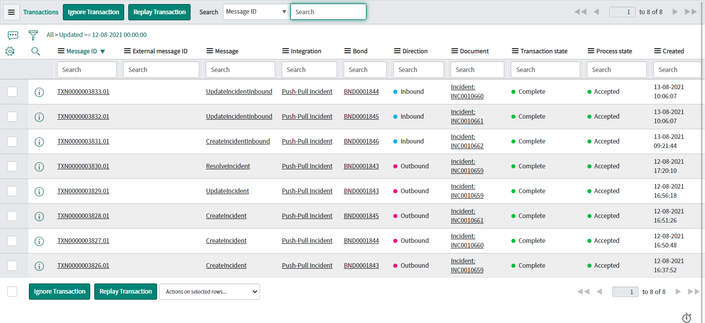 We can see that two UpdateIncidentInbound messages have been received. Both are Complete & Accepted & display the relevant Incident & Bond numbers.