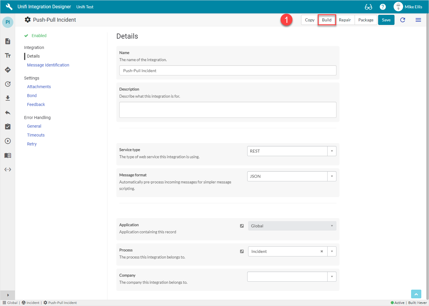 As mentioned on the 'CreateIncidentInboundReceipt Fields' page, we saw that a 'Build Integration' button had appeared in the banner at the top of the page. This was because, whenever a change is made to a Field record that is associated to a Message (whether that is being created, updated, or deleted) the button will be available and act as a visual reminder that changes have been made and Message Script(s) need to be built.