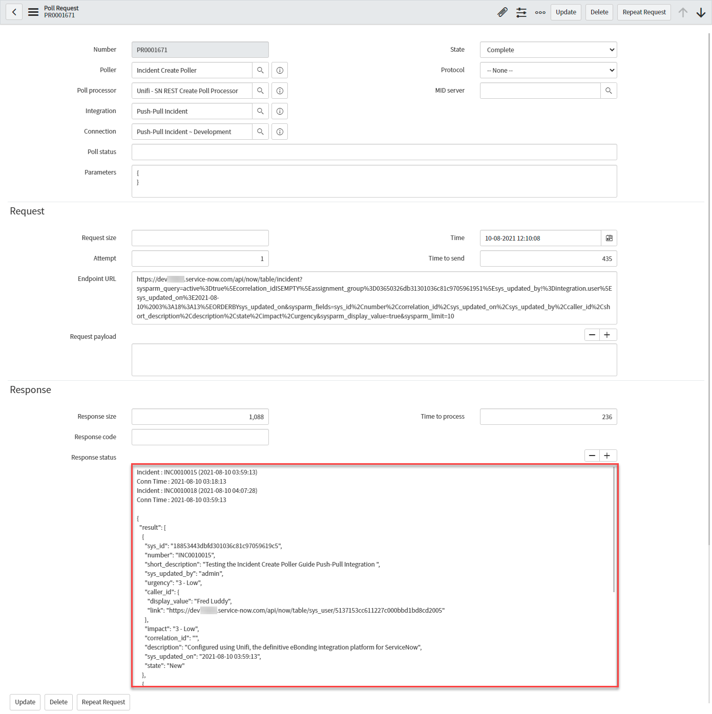 In native ServiceNow, navigate to Unifi > Polling > Poll Requests. Click to Open & view the generated Poll Request. Confirm that only the two Incidents were found (this is exactly as we expect because we are only polling for Incidents assigned to a specific Assignment group):
