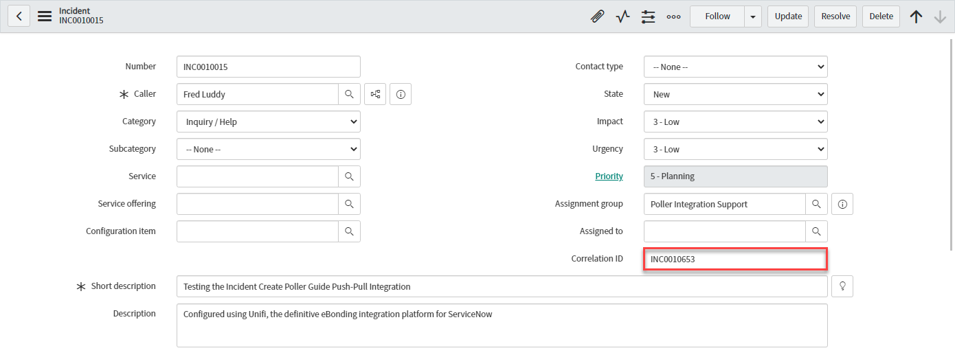 For completeness, to prove we are only querying and pulling back data from non-bonded records, create an incident in this instance which causes the outbound CreateIncident Message to fire - as per the Outbound Incident Guidearrow-up-right - (creating a new Incident in the remote instance) & run the Poller again.