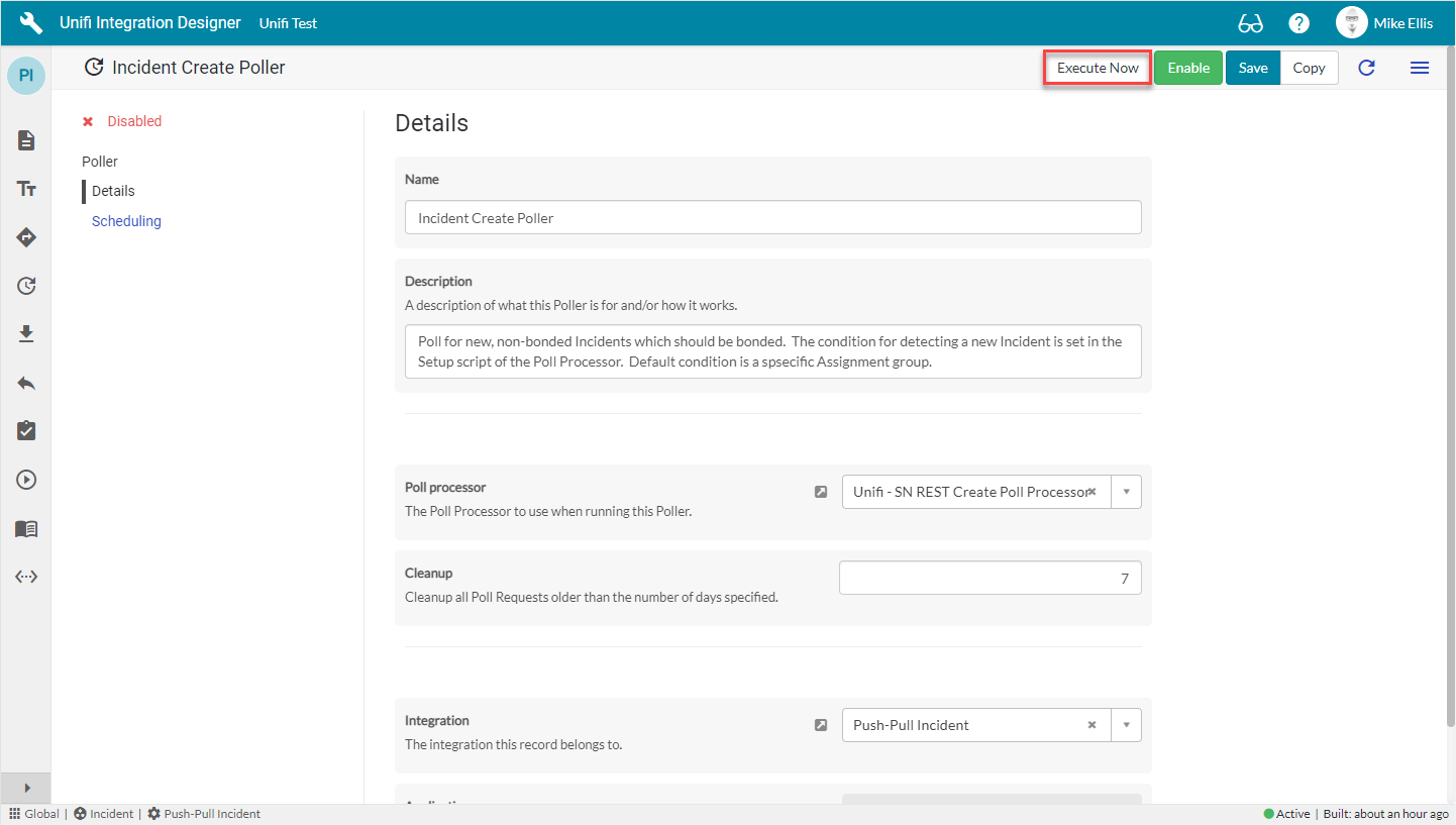 It may help to turn off the Poller we created (set Active to 'false') whilst conducting these tests and to manually execute it as required (this can still be done even if the Poller is inactive). This is so that we don't have to wait for the Poller to run, but rather manually activate it when needed by clicking 'Execute Now'.