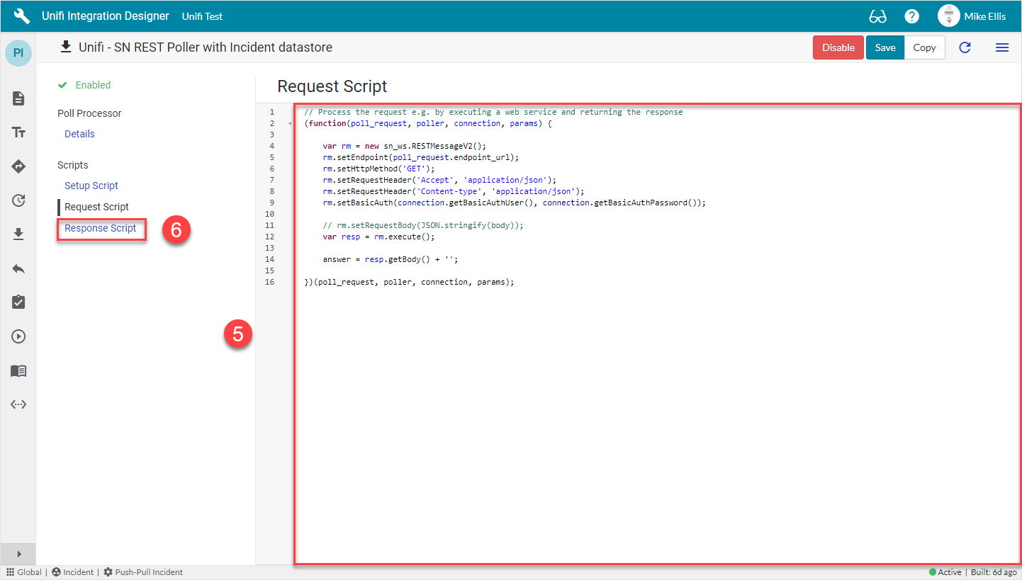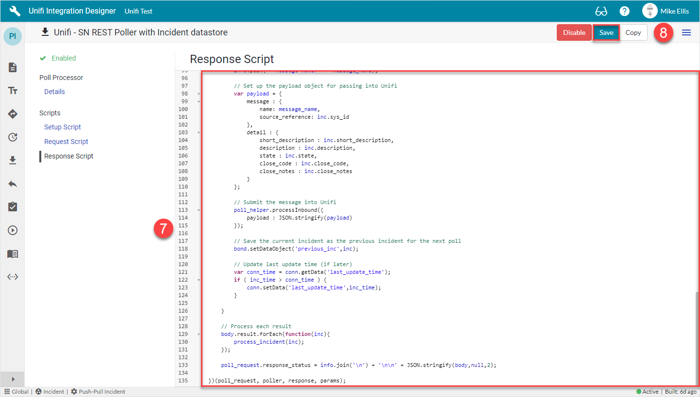 The Response Script is used to process the information returned from the remote system. We will pass this data to Unifi, telling it which Message to use to process the data.