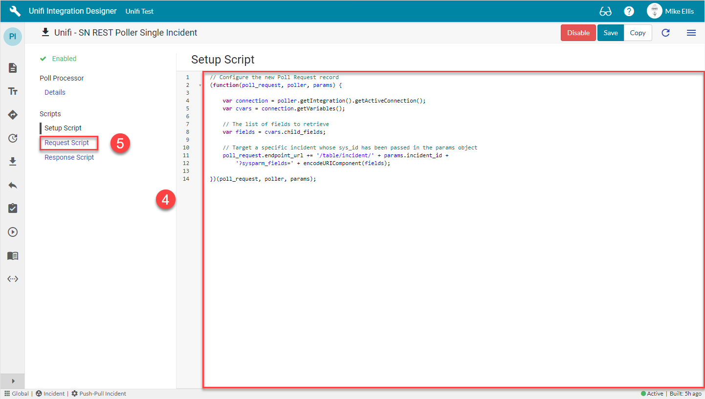 The Request Script is used to reach into the remote system and execute the request. We will use the ServiceNow RESTMessageV2() web service to make a REST call to the URL defined in the Setup Script.