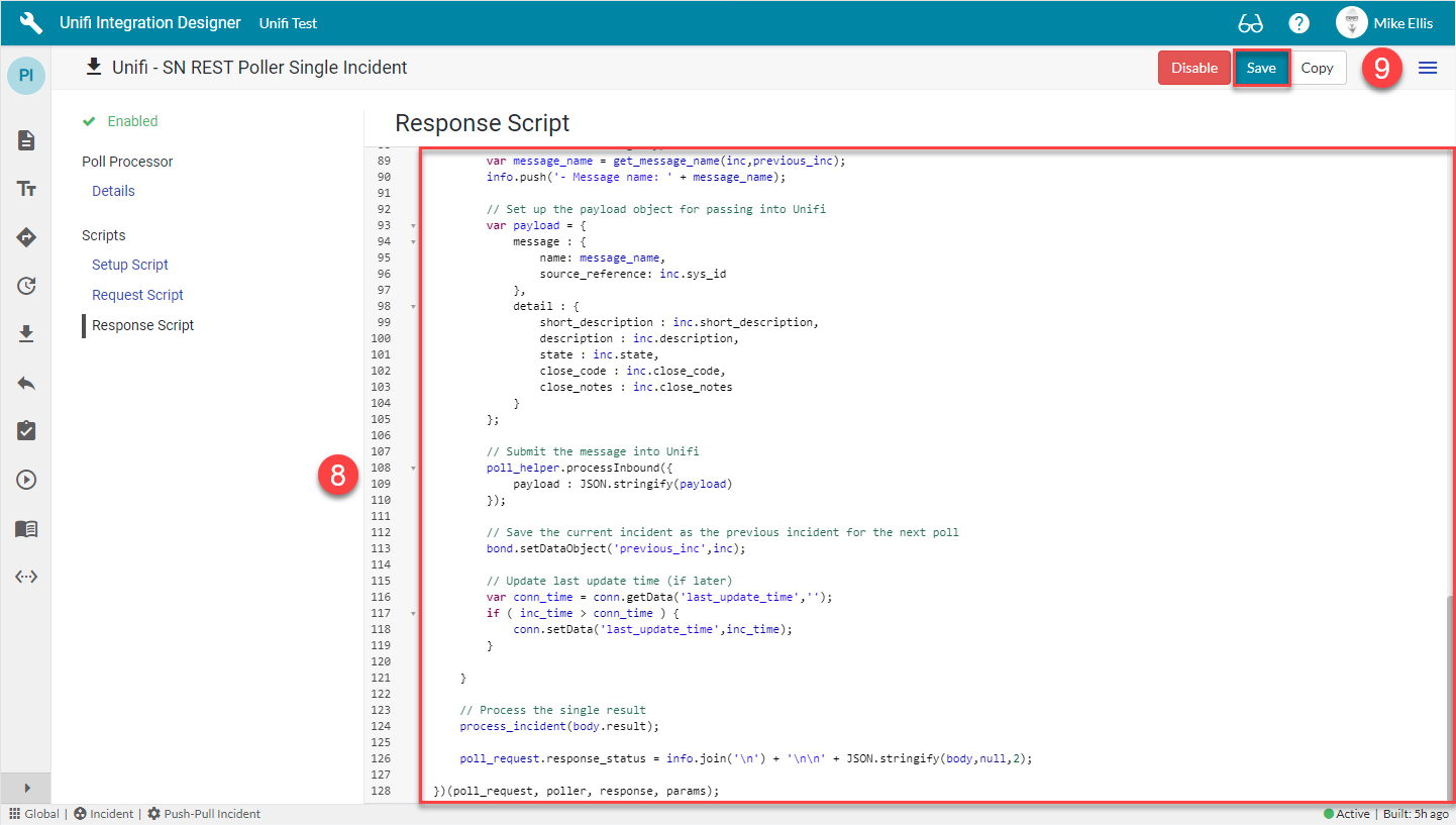 The Response Script is used to process the information returned from the remote system. We will pass this data to Unifi, telling it which Message to use to process the data.