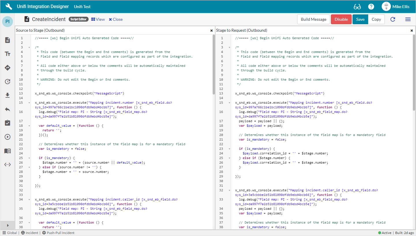 The new auto-generated code (mapping the incident number to the correlation id & mapping the Incident description) will appear between the Begin & End Comment along with the code that was already there (which we had previously created using the Outbound Incident Guide). Your code may differ, depending on which Field records you created to satisfy your mapping requirements.