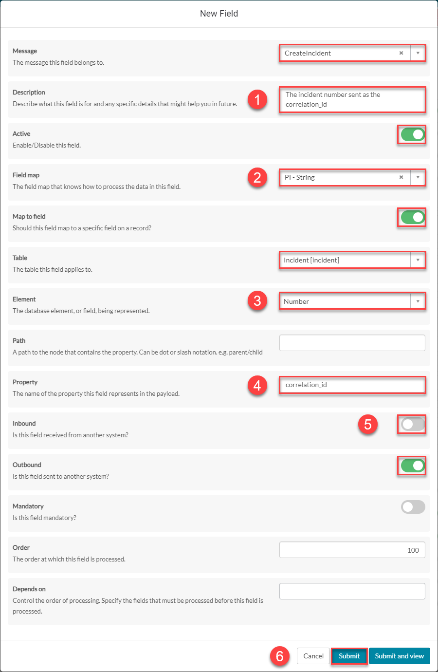 To ensure that our CreateIncident Message is sending the relevant data we need to configure a new Field record that will send the Incident number as the correlation id. We will make use of the previously copied String Field Map record.