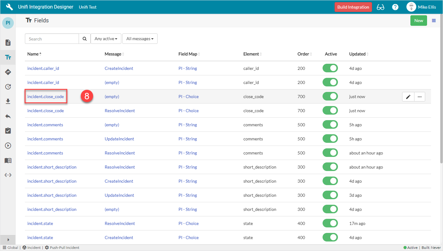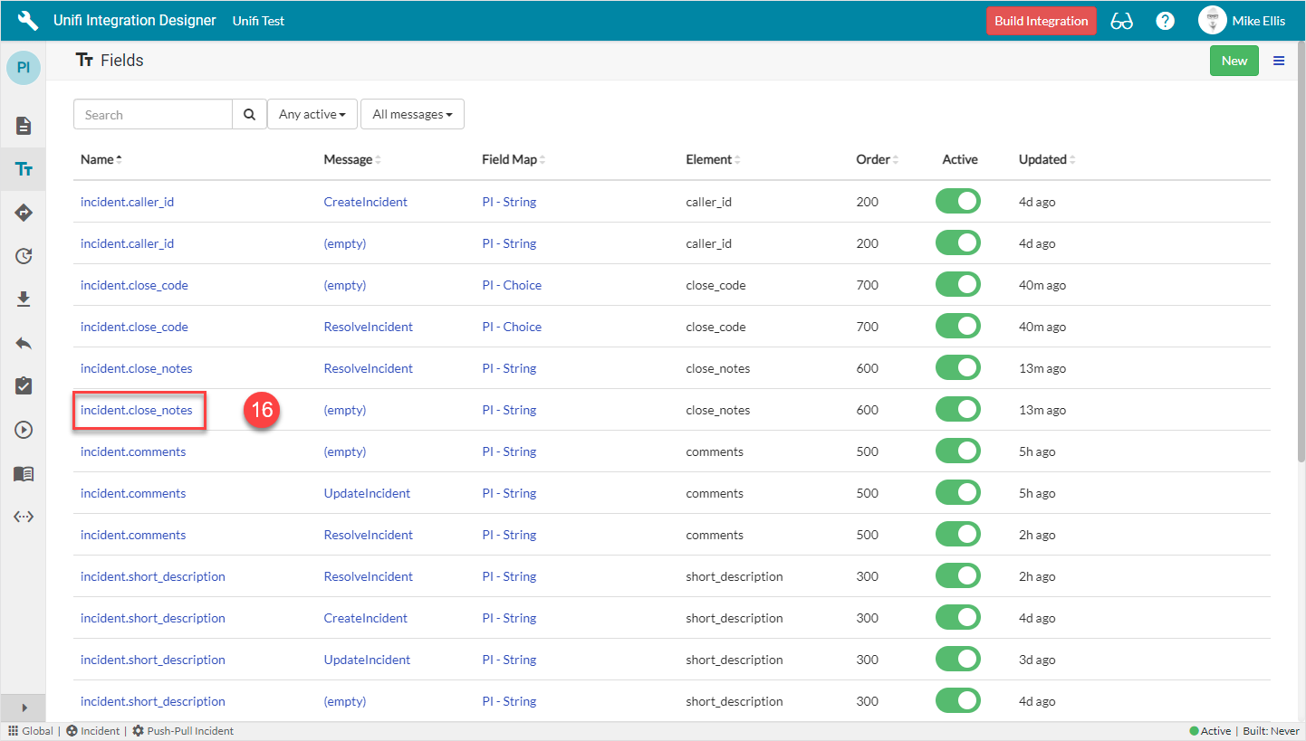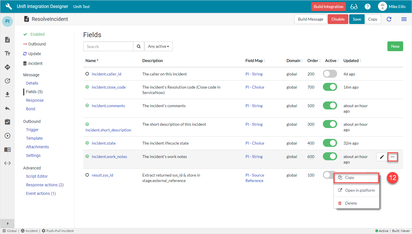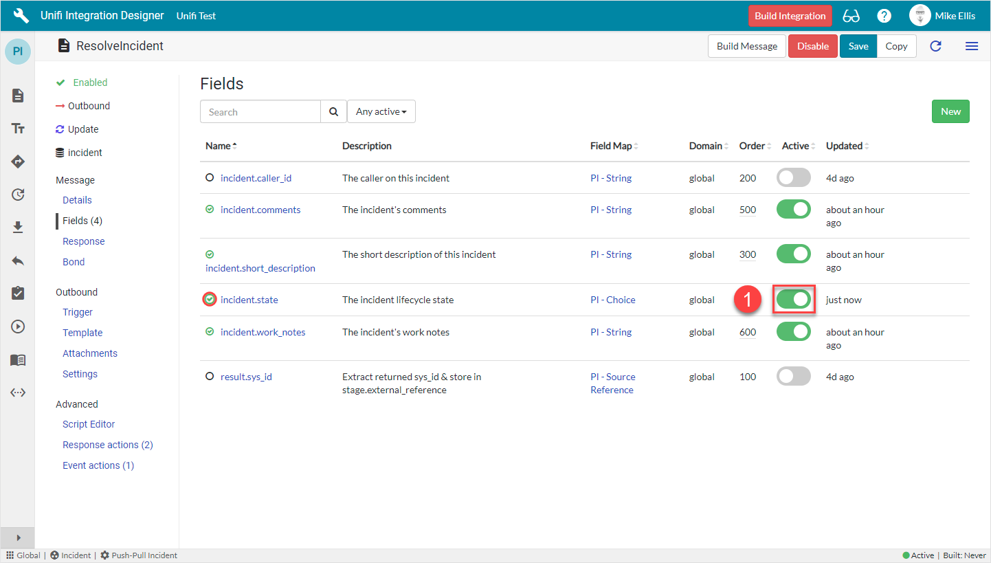 The 'incident.comments', 'incident.work_notes' and 'incident.short_description' Field records are already in place because they were also copied when we copied the Message. We can choose to include, or exclude as many of those and the Integration level ones that are available depending on our requirements (by either activating or deactivating the relevant Fields). We will choose to keep the existing Message level Fields and add the available incident.state (Integration level) Field.