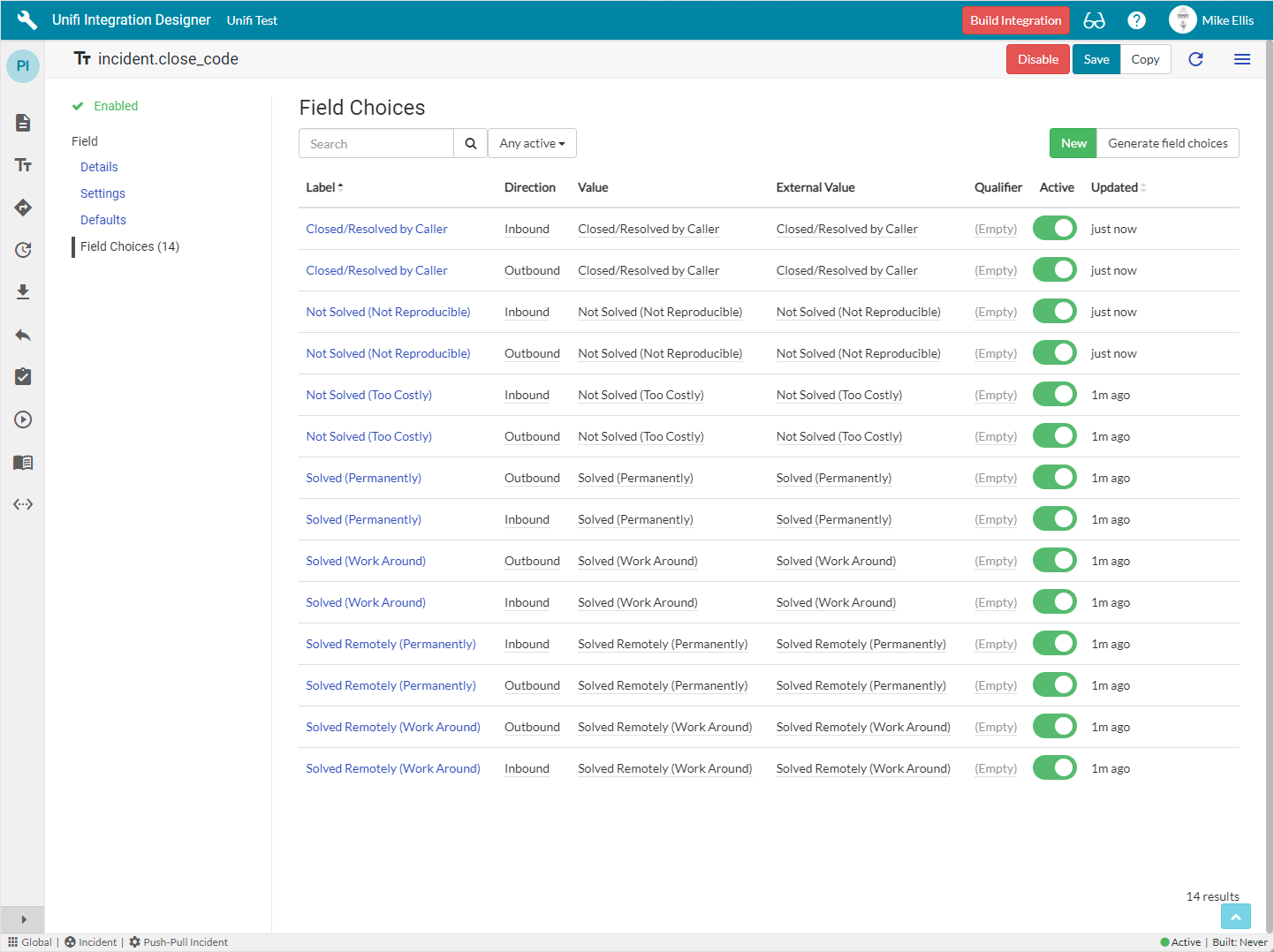 As with 'incident.state' the 'incident.close_code' Field record is a Choice 'type' Field. We will, therefore, configure the choices once at the Integration level. We'll first configure the Message level Field and then move on to configure the choices on its Integration level counterpart.