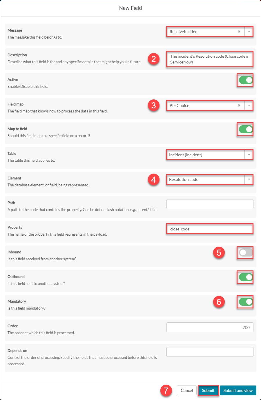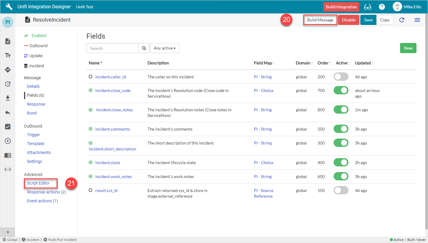 We will utilise the Field & Field Map records to configure the Message Scripts for the ResolveIncident Message.