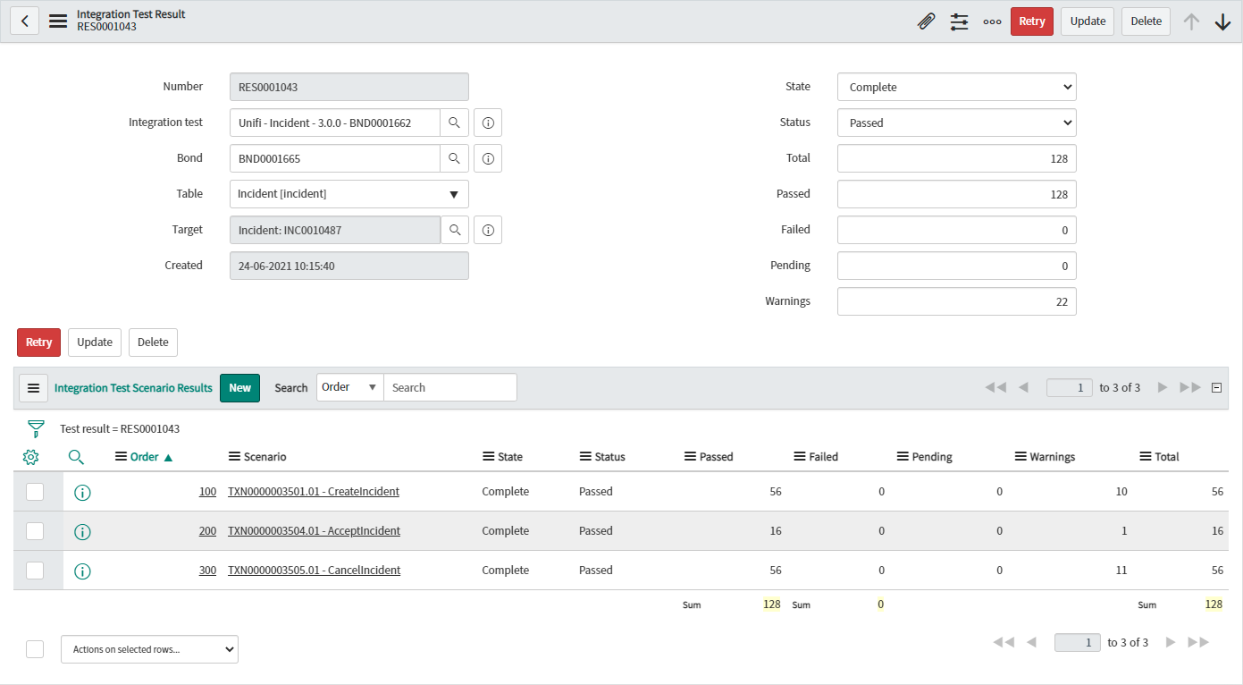 When you run an Integration Test, Unifi creates an Integration Test Result record to capture the results of the test run. Each Integration Test Result record will correlate to the Integration Test that was run. The Test Result contains the individual 'Integration Test Scenario Results'. Each of which are tallied and rolled up to the parent record and grouped according to various categories.