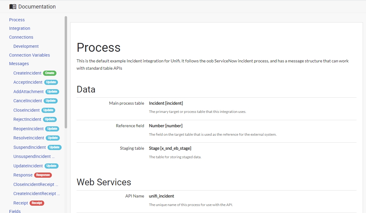 Documenting your integration build is made simple and easy with Unifi's auto-documentation features. From any integration, select the Documentation button to see exactly what has been configured in an easy to read format.