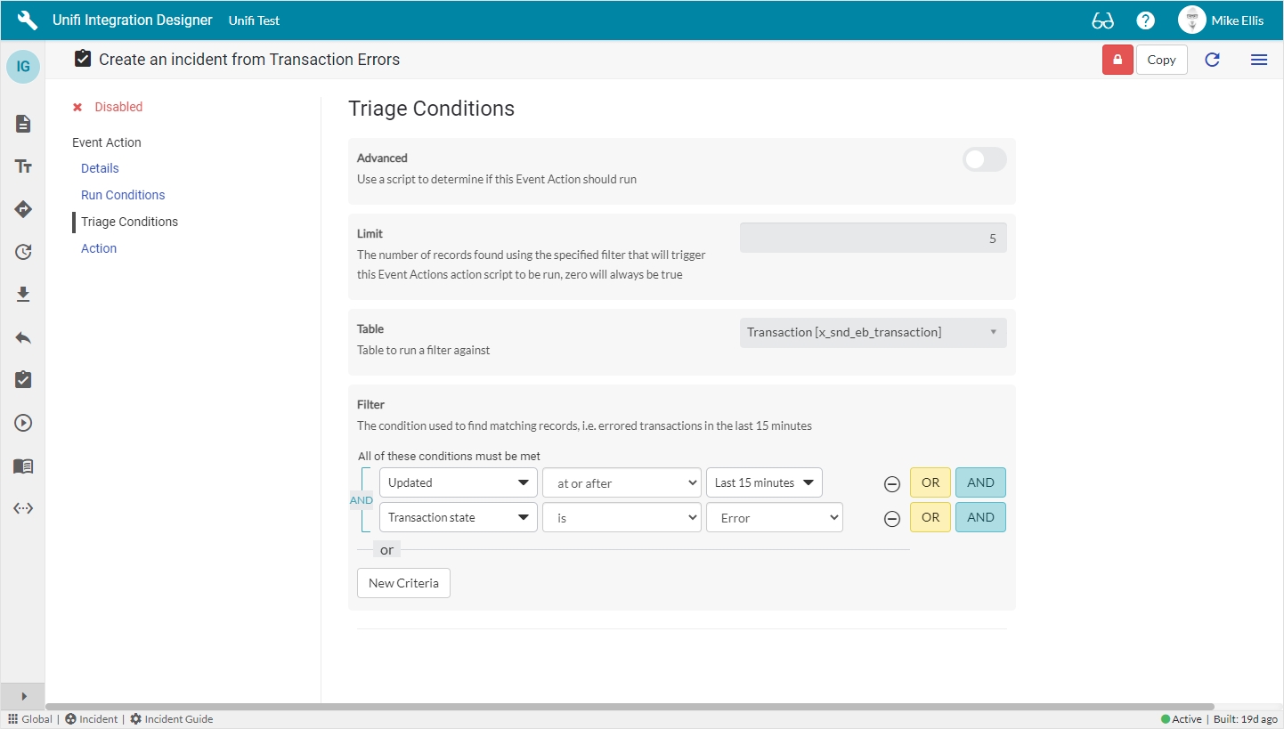 In Unifi, we throw events for Transaction State changes. Like standard ServiceNow Script Actions, Event Actions respond to those events. Unlike Script Actions, however (where there is a simple one-to-one relationship between the event and the action), Event Actions provide an added level of abstraction in that they offer functionality that enables you to triage the events and make decisions about how you deal with them according to the conditions you configure.