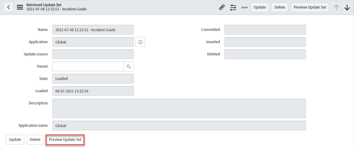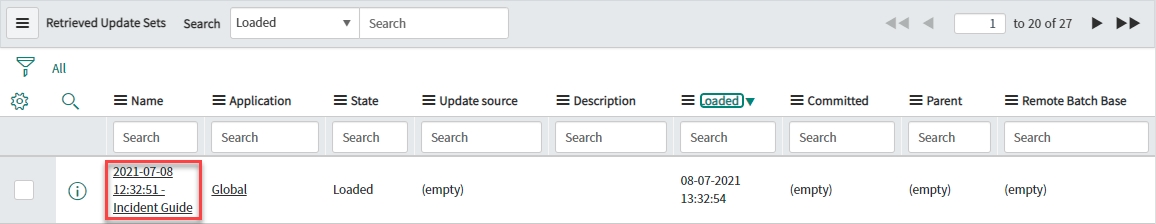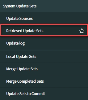 In the Application Navigator of the external instance, navigate to System Update Sets > Retrieved Update Sets.