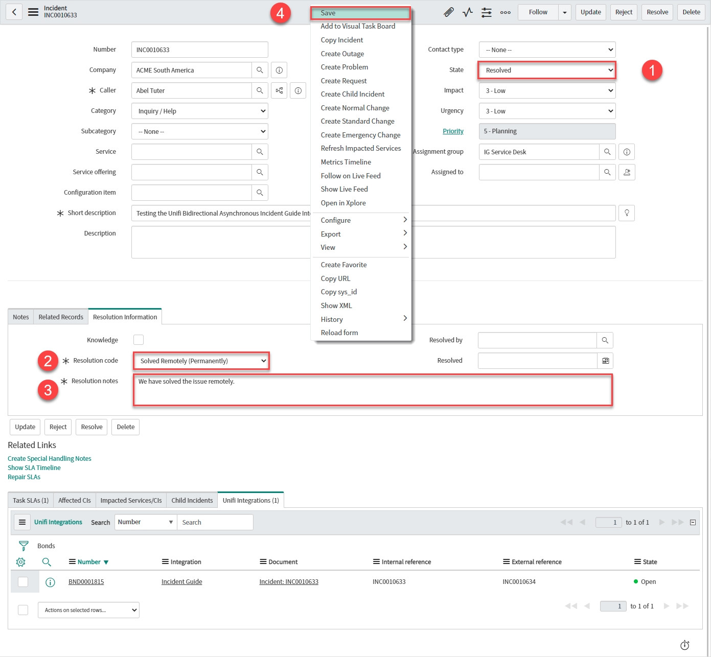 You should see an Info Message, confirming the ResolveIncident Message is being sent to your Integration: