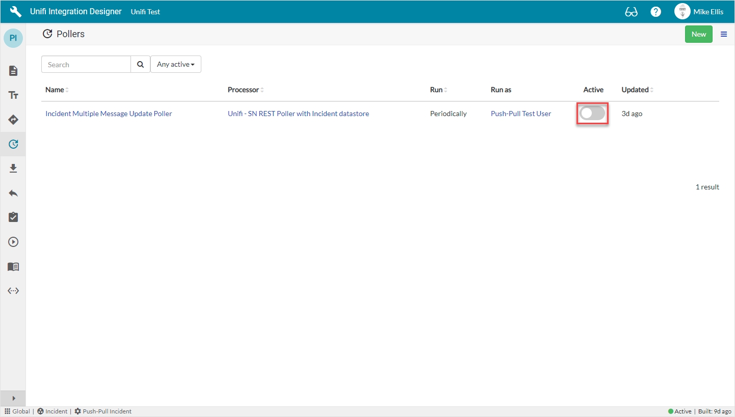 To turn off the Poller, in the Unifi Integration Designer window, navigate to the 'Pollers' icon & set Active to false. (If you've created this Multiple Message Poller by editing the previously configured Update Poller, it may already be inactive.)