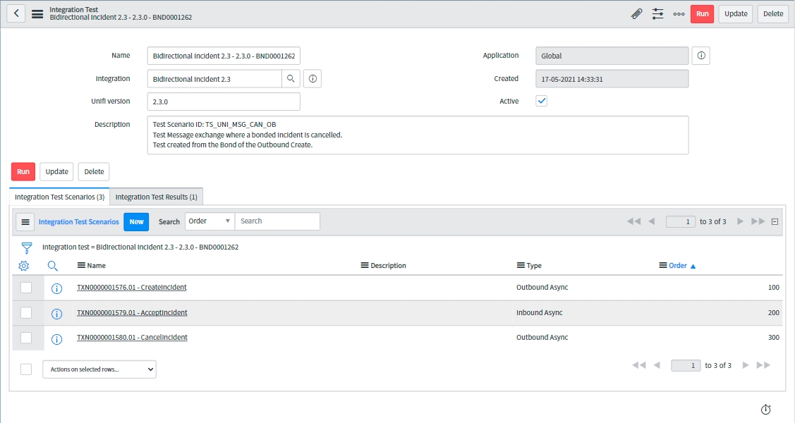 An Integration Test is the overarching automated test record and correlates to the Bond. At the click of a button, Unifi will generate an Integration Test directly from the Bond record. The test comprises each of the Integration Test Scenarios (which correlate to the Transactions on that Bond). This means you can create an automated test based on real-world data in your instance which can be re-used to test the functionality of the Unifi process.