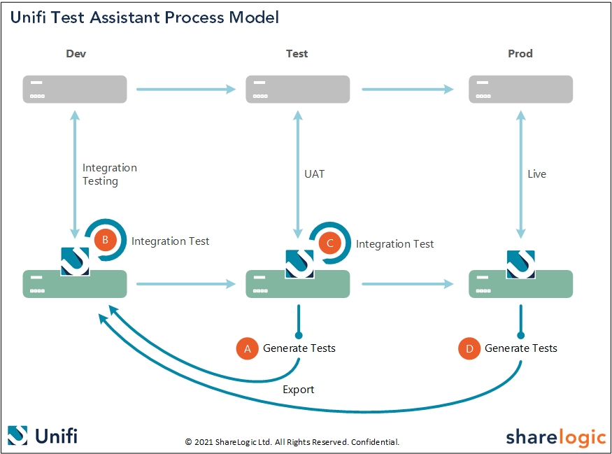 The Unifi Test Assistant Process Model shows how Unifi Test Assistant has been built to work with your integration and platform release process.