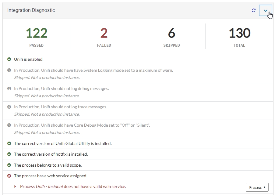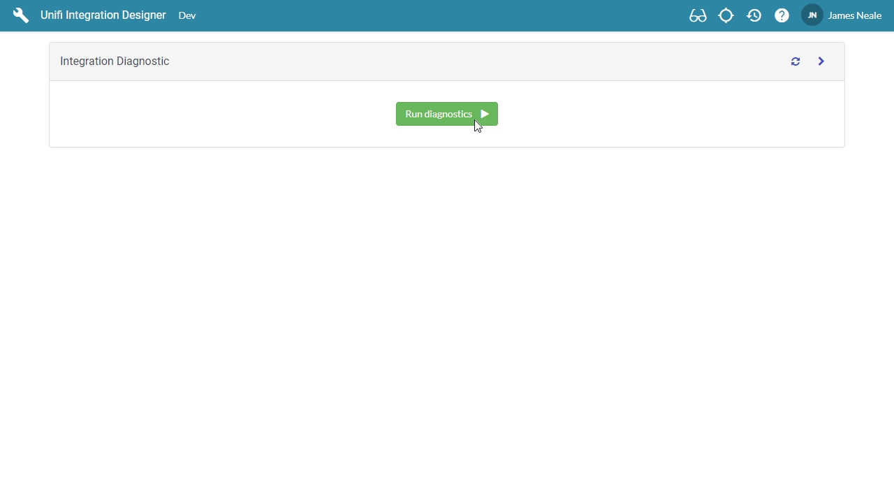Diagnostics for single integrations are automatically performed when you open the integration in Unifi Designer. Version 4 introduces the integration dashboard which includes the diagnostic.