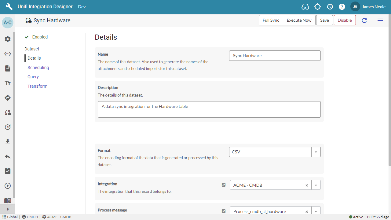 Unifi uses ServiceNow Import Sets since they offer a well understood mechanism for importing data with performance benefits. The mapping is automatically managed by Unifi and handled through a transform script which uses inbound Fields and Field maps (via the Stage to Target Message Script) to transform the data and write it to the target records.