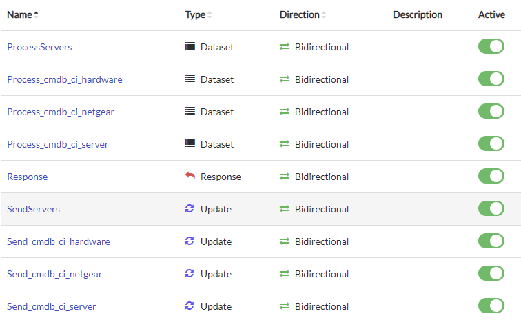 When an inbound Send message (as specificed on the Dataset) with a data attachment is received, the attachment will be processed with each record being inserted into an import set table directly related to the Dataset. The import set table is automatically created and maintained during the Integration Build process.