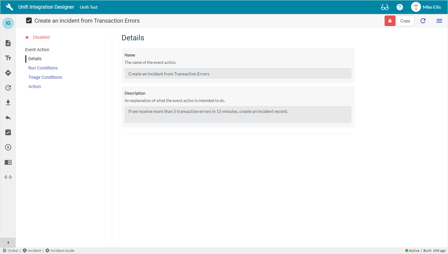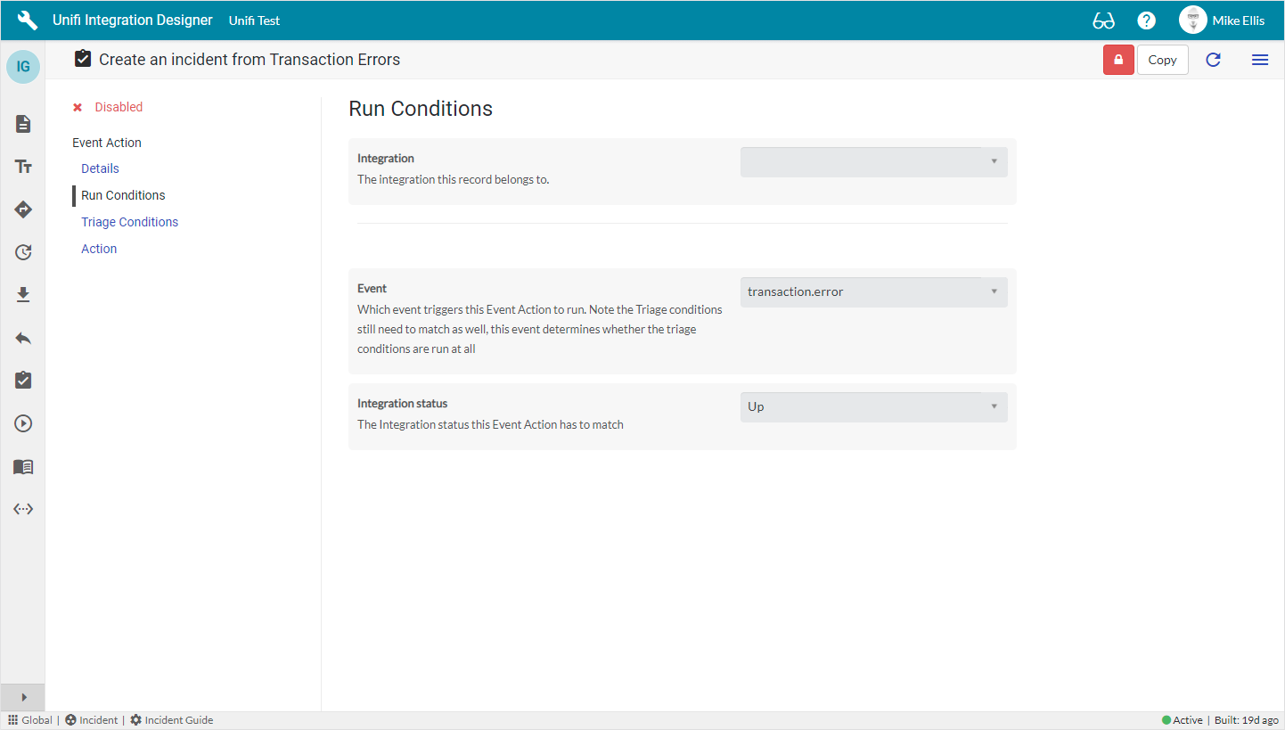 Run Conditions. These stipulate the conditions which cause the Event Action to fire. They specify which Integration* and which Event* the Event Action is responding to (*both Integration & Event are mandatory). They can even be dependent on the status of the integration and apply to specific messages.