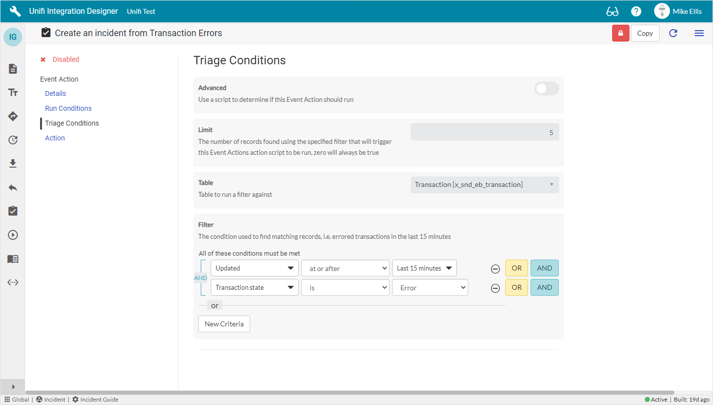 In Unifi, we throw events for Transaction State changes. Like standard ServiceNow Script Actions, Event Actions respond to those events. Unlike Script Actions, however (where there is a simple one-to-one relationship between the event and the action), Event Actions provide an added level of abstraction in that they offer functionality that enables you to triage the events and make decisions about how you deal with them according to the conditions you configure.