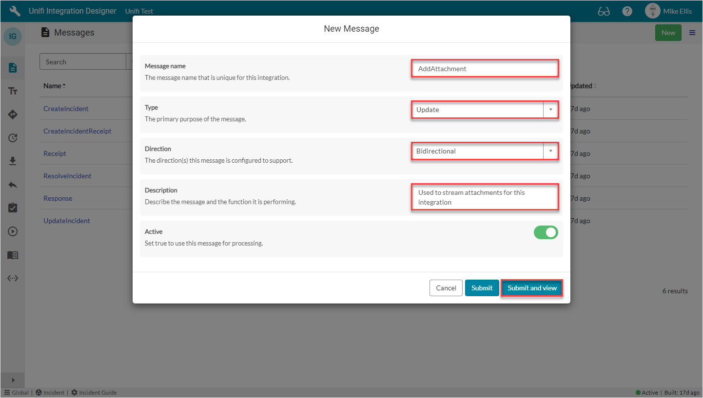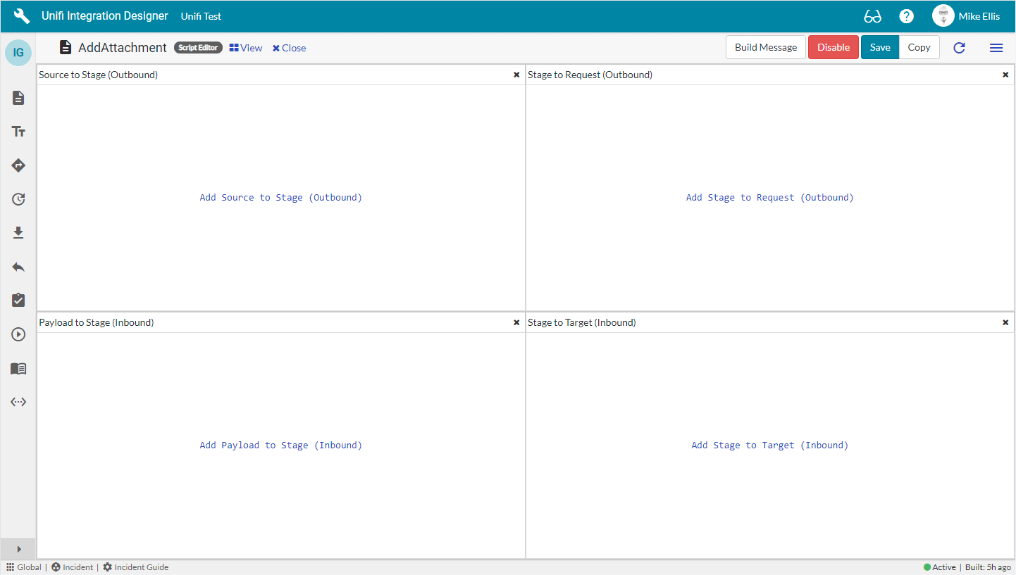 In Unifi Integration Designer, click on the 'Messages' icon & then New to begin configuring the AddAttachment Message.