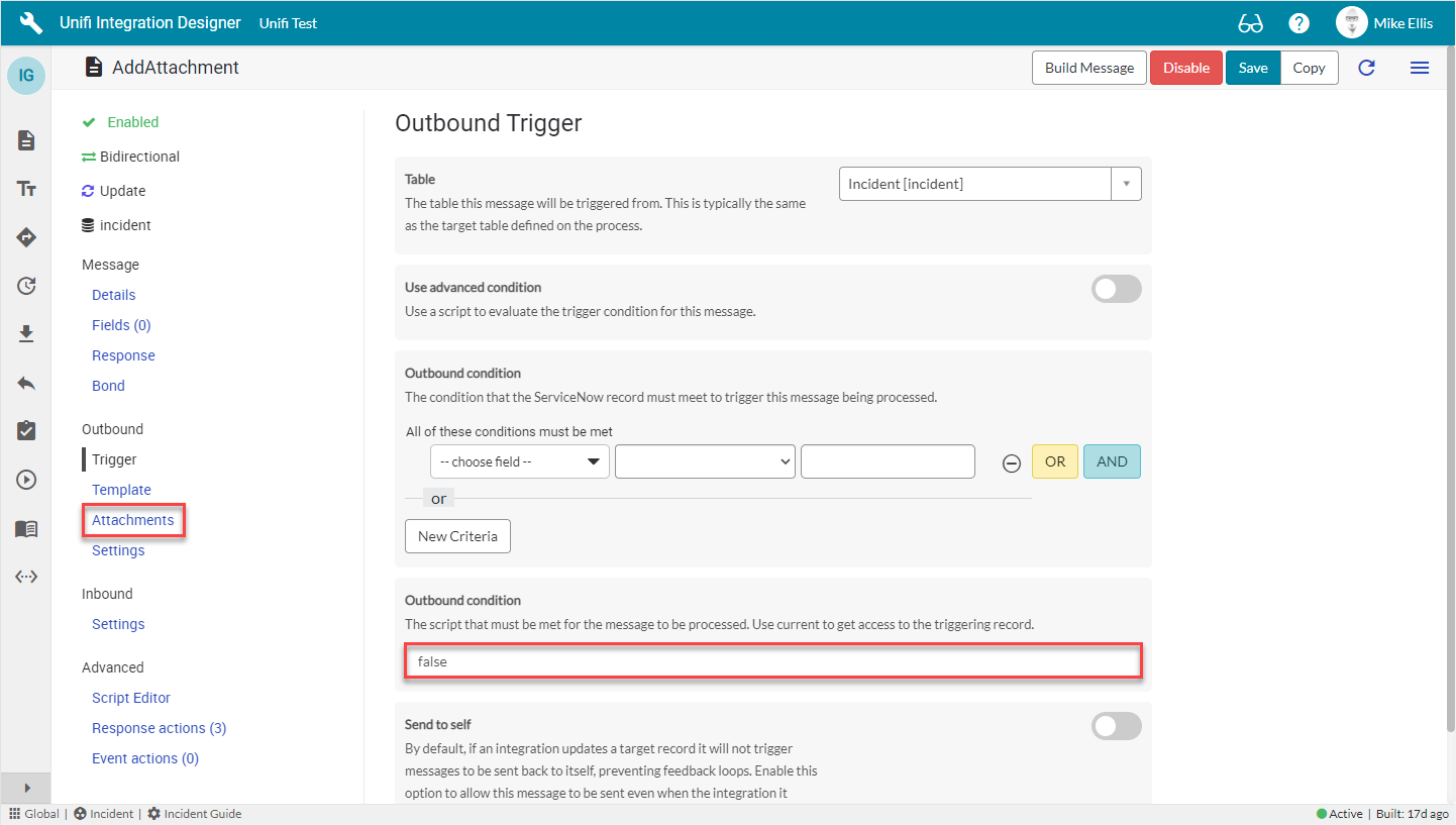 It is not always necessary for you to enter a condition. The value given is an example. You may create any condition (or not) to align with your business process requirements. In this case, it makes sense to set the Outbound Condition to false because we do not want Unifi to send this message on any update of the source record. Typically, we would configure different messages to align with state changes (e.g. Close, Resolve).