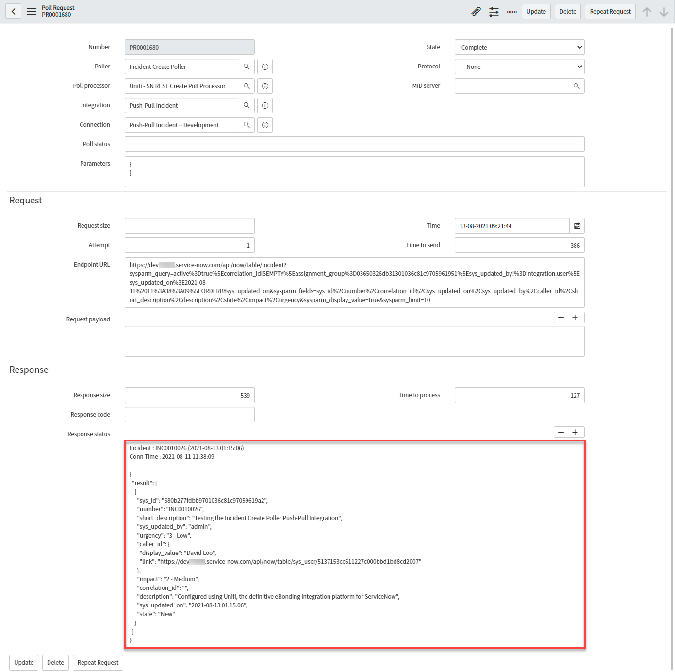 In native ServiceNow, navigate to Unifi > Polling > Poll Requests. Click to Open & view the generated Poll Request. Confirm that only the one Incident was found (this is exactly as we expect because we are only polling for Incidents assigned to a specific Assignment group):