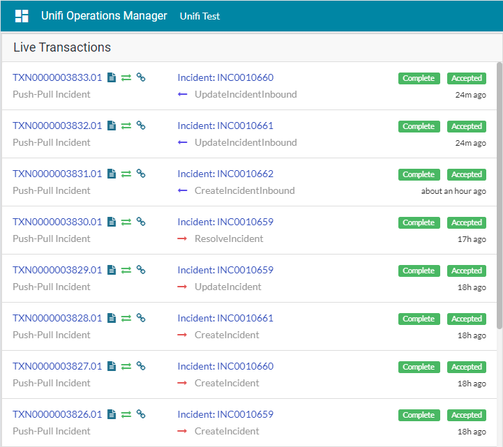View the Transactions that have been sent. This can be done either in Native ServiceNow, or in Unifi Operations Manager.