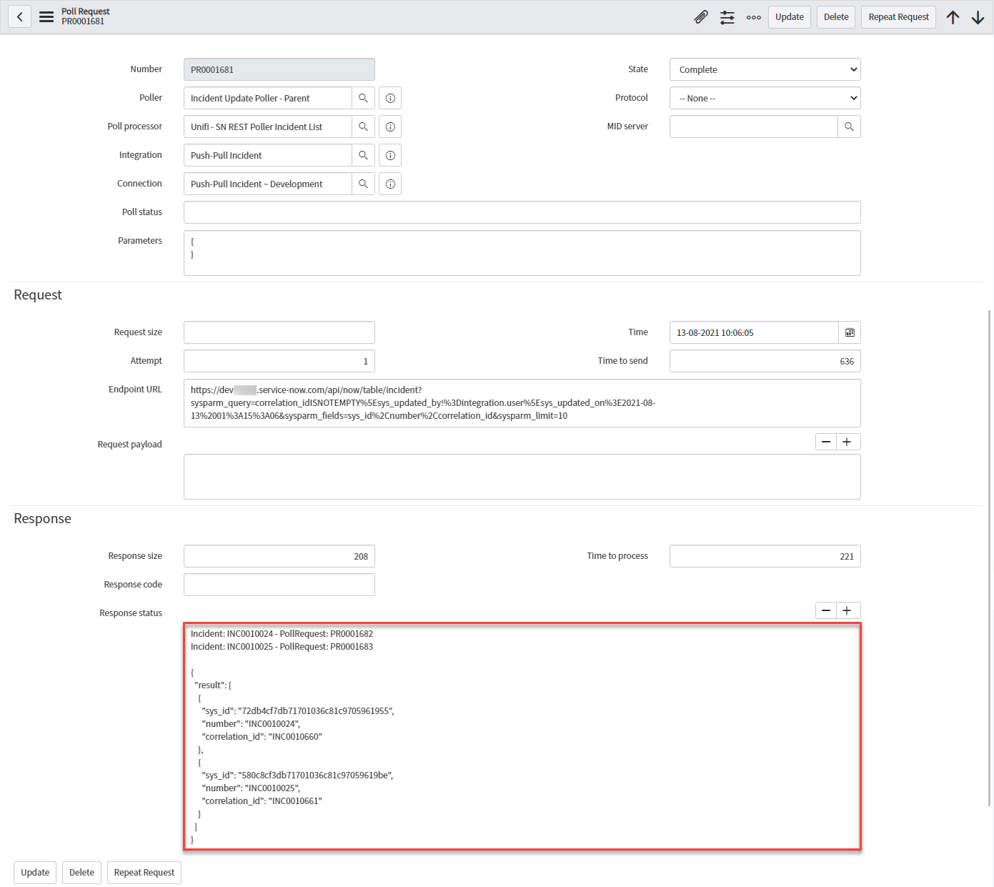 Open the corresponding Parent Poll Request & confirm that both Incidents were found (and only those) and that subsequent child Poll Requests were also triggered: