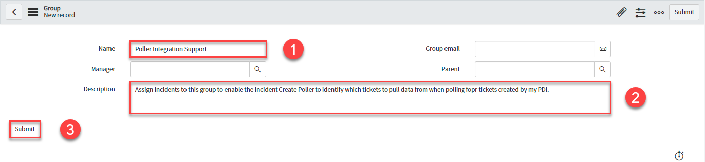This variable will contain the sys id of the group created above. It will be used in the Poll Processor Setup script to identify which non-bonded Incidents to query.