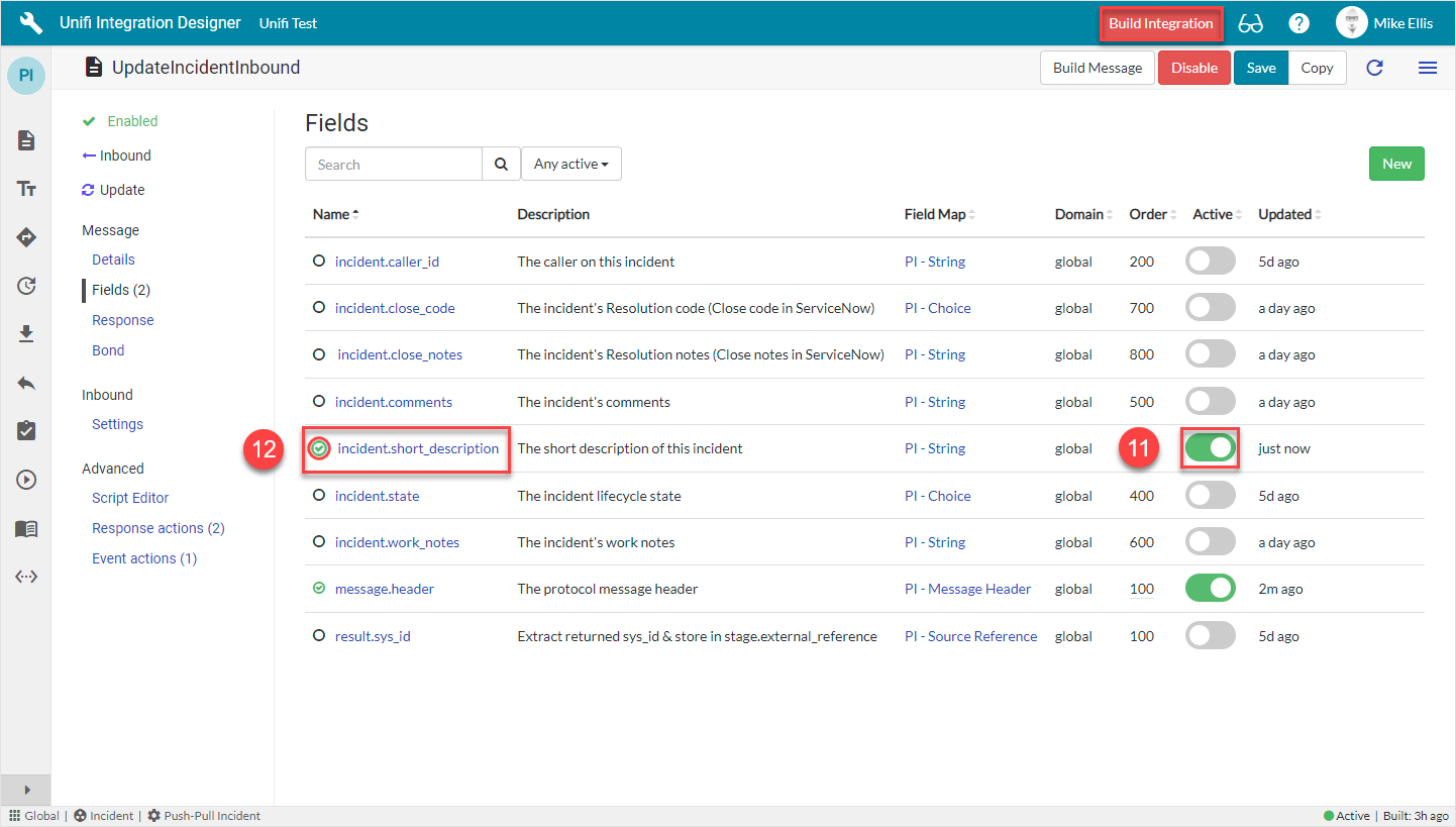 The empty circle icon next to the Field name turns green & contains a green ‘check’ (to indicate that Message level configuration exists for this Field) when we set Active to true. (The ‘Build Integration’ button became visible in the banner when we created the 'message.header' Field).