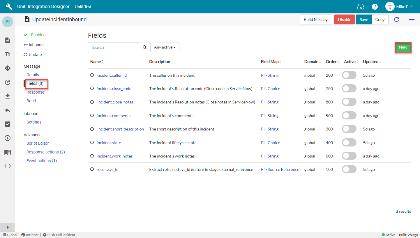 Back in the UpdateIncidentInbound Message, navigate to Message > Fields. Click New.