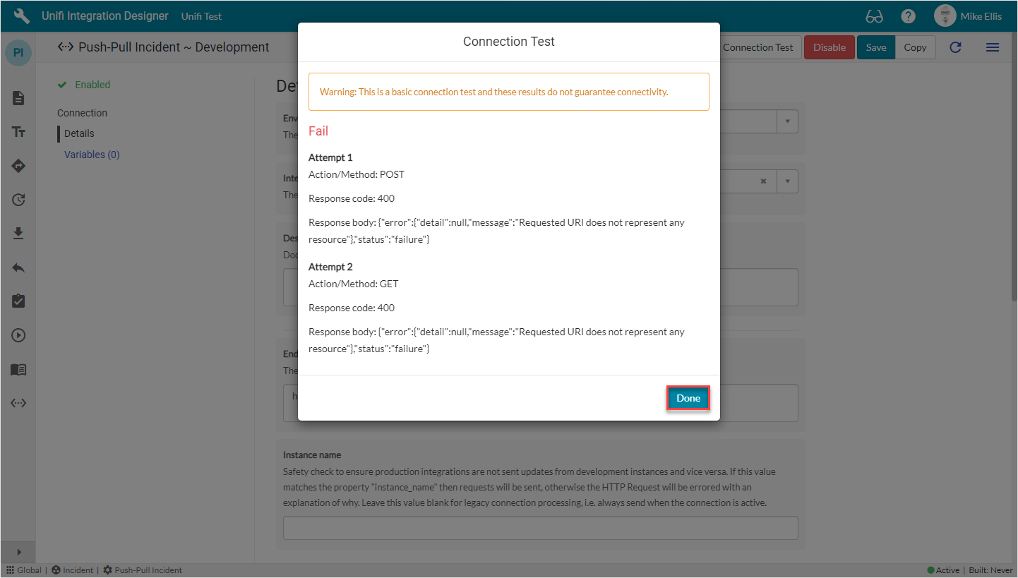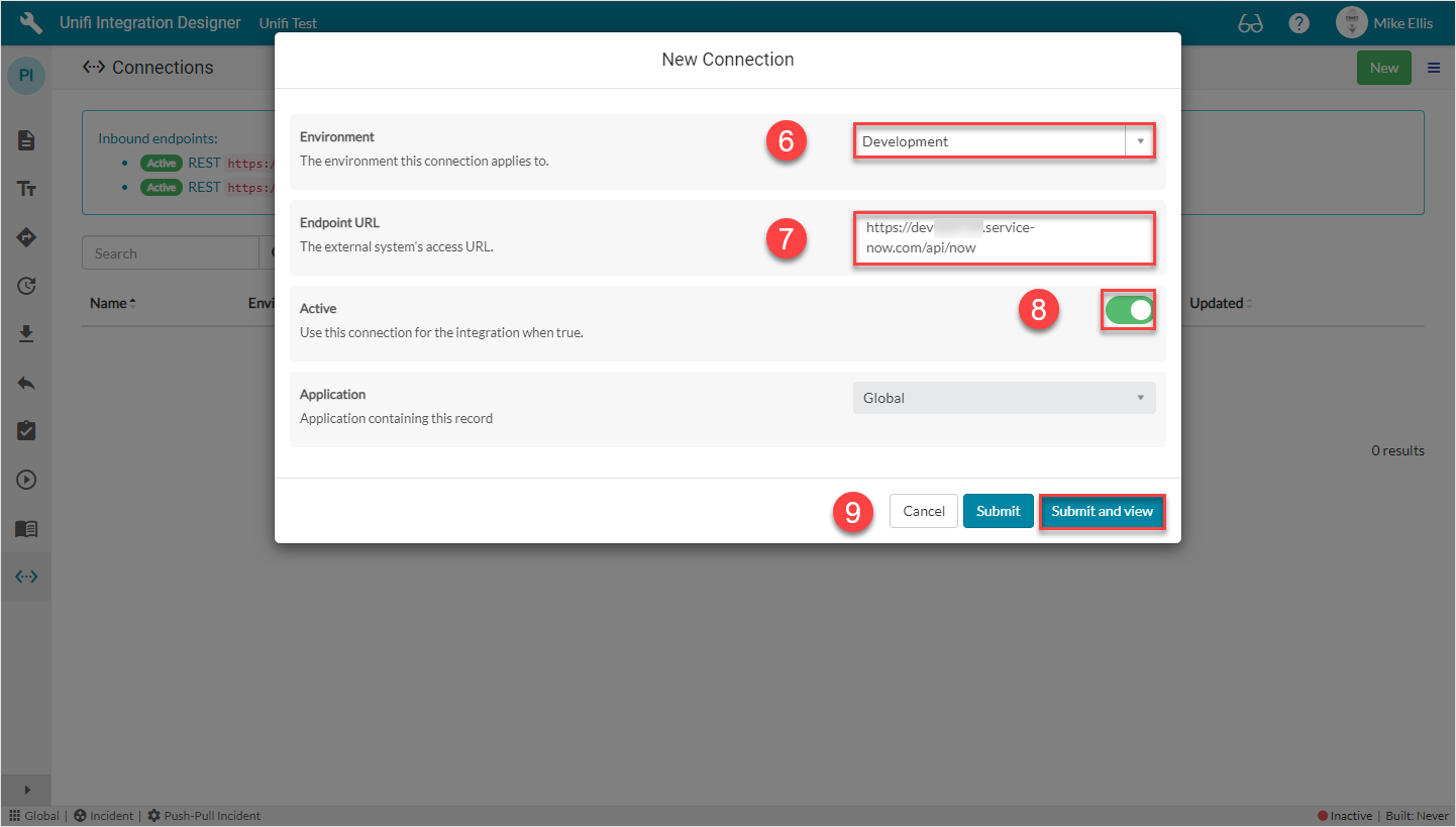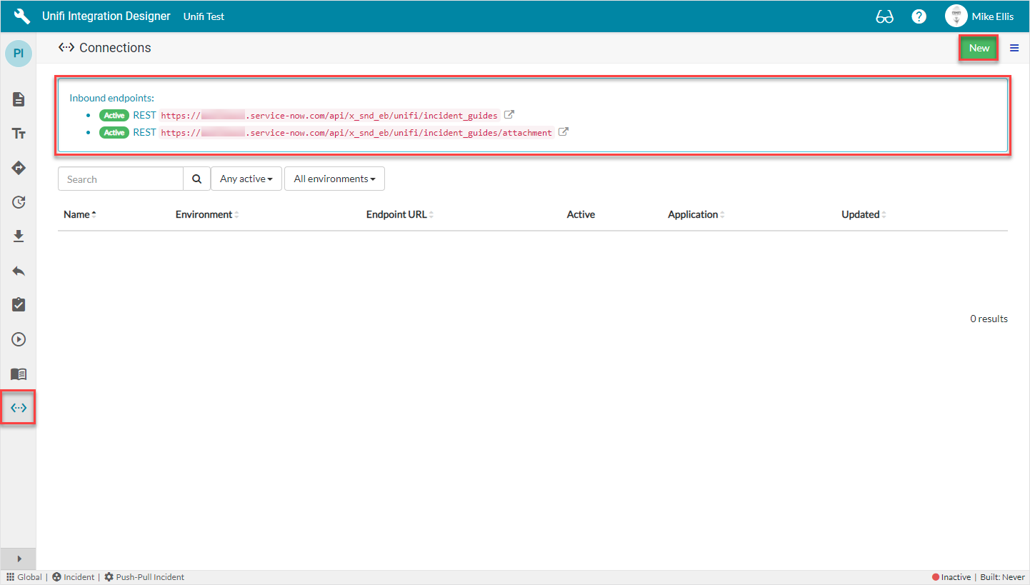 Back in the Unifi Integration Designer window, after clicking the 'Connections' icon, the first thing you will notice is a widget at the top of the page which clearly displays the inbound endpoints (REST Resources) which were automatically created when the Process was configured.