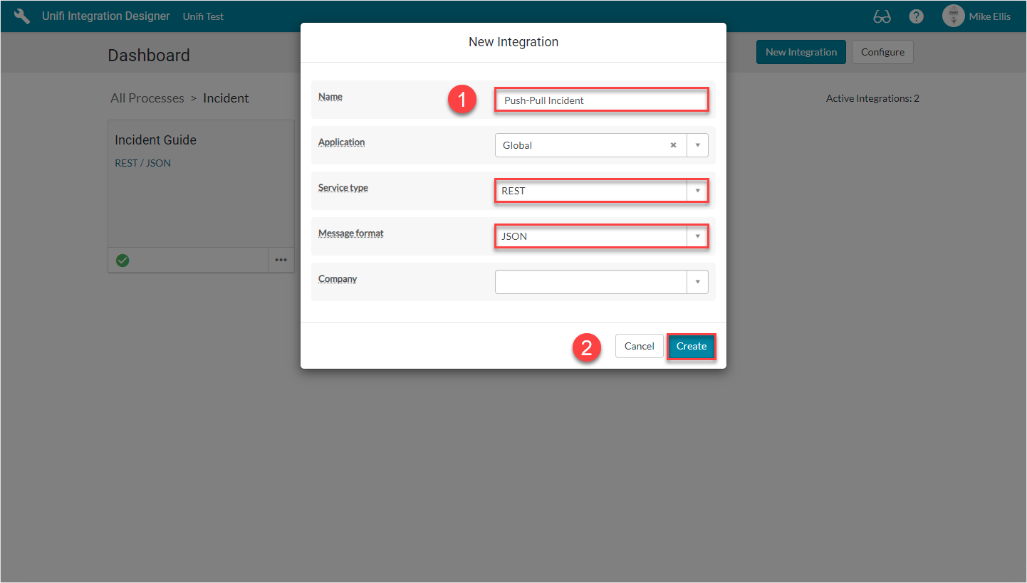 In the Unifi Integration Designer window, after clicking either on the '+' tile or 'New Integration', you are given a 'New Integration' modal to complete.