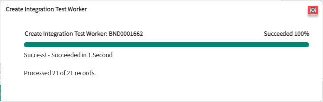 The Create Integration Test Worker modal is displayed, showing progress. Close the modal.