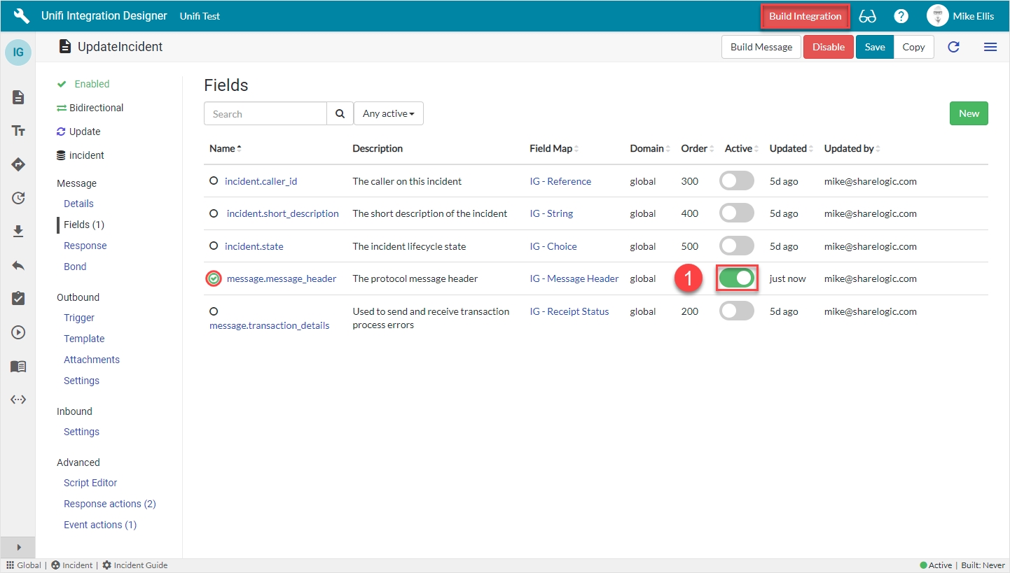 As before, by setting the Active flag to true on the Integration level Field record listed on the Message, Unifi has automatically created the Message level counterpart.