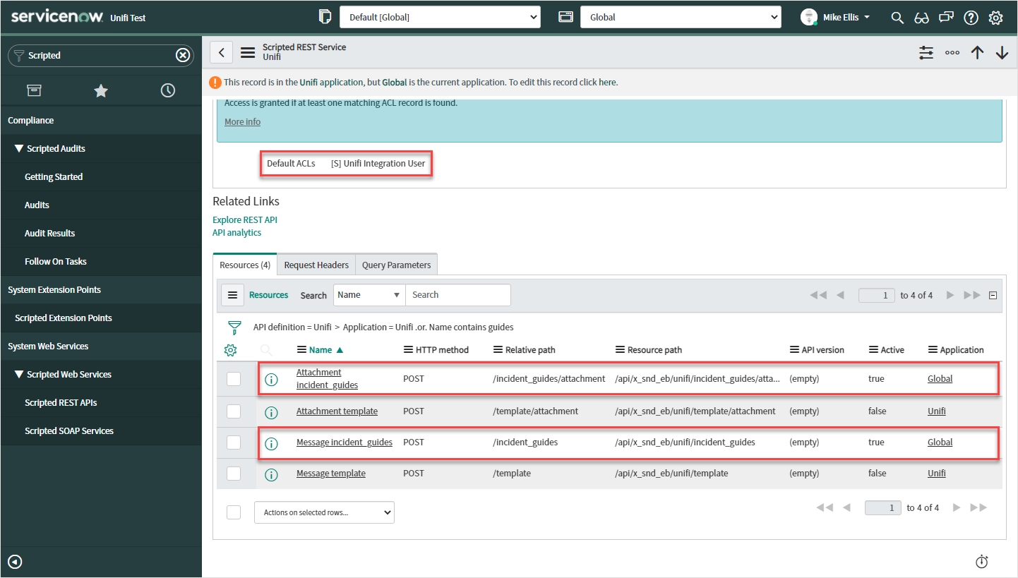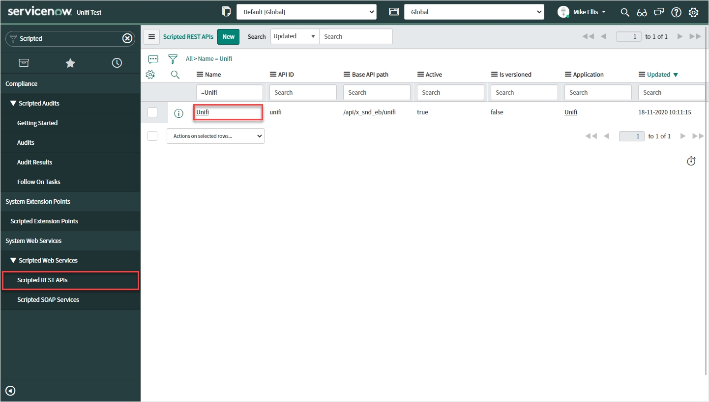 In native ServiceNow, navigate to System Web Services > Scripted Web Services > Scripted REST APIs. Click Unifi.
