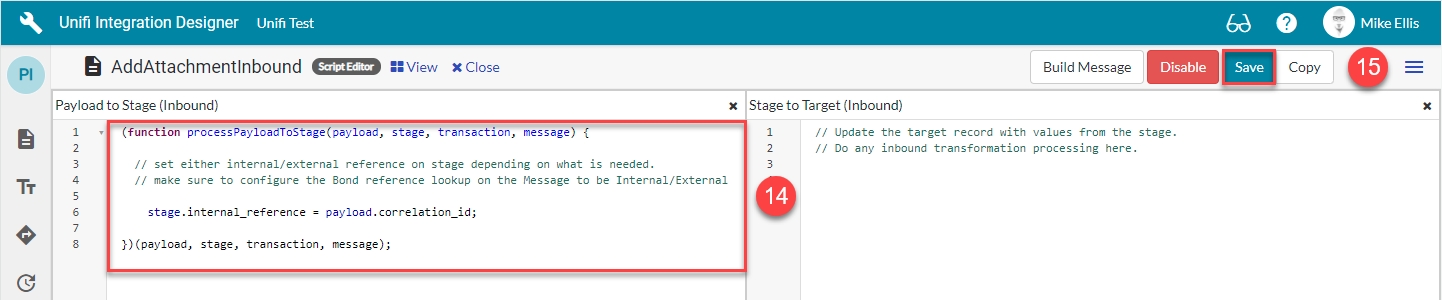 })(payload, stage, transaction, message);Your Script Editor fields should look like this: